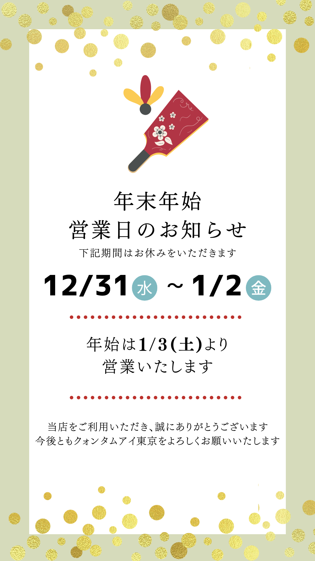 クォンタムアイ 東京の年末年始および新年以降の営業日をお伝えします。