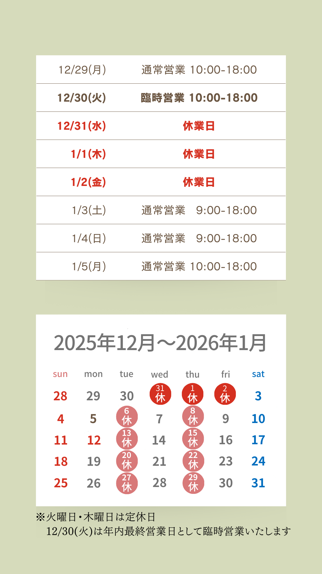 火曜日は定休日とさせていただいておりますが、本年最終営業日として臨時営業いたします。